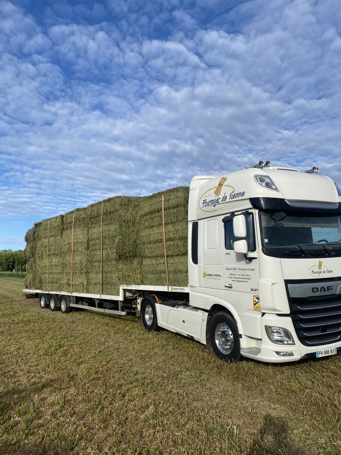 Une fois prête, la luzerne est pressée à haute densité (120×90 ou 120×70 sur demande). Ce format assure une logistique optimisée et une manipulation plus aisée.